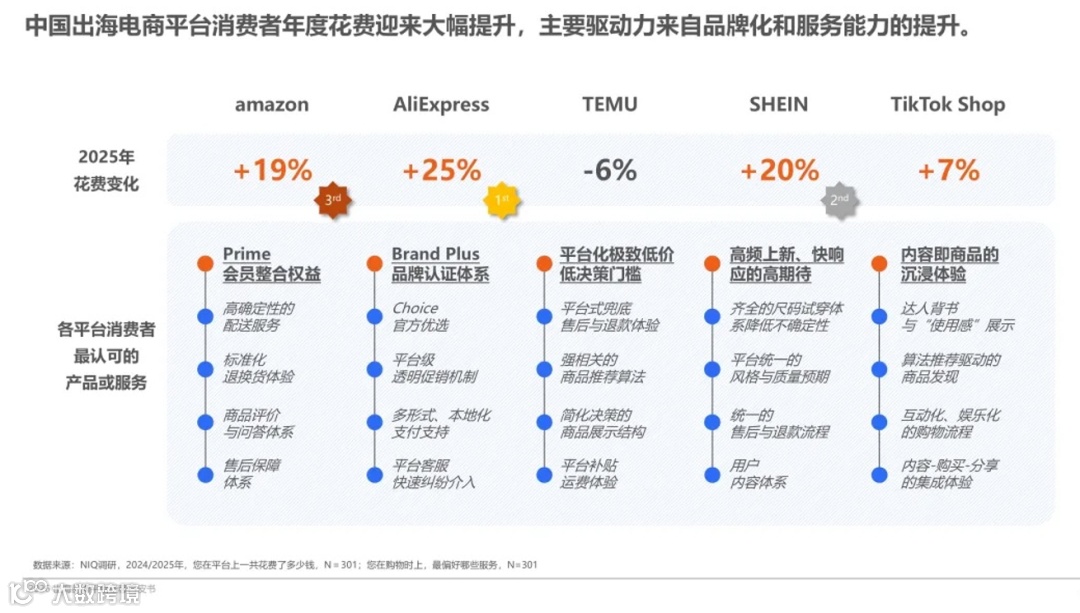 在“出海四小龙”的差异化竞争中,速卖通被30%的欧洲消费者视为“最有可能挑战亚马逊”的平台,认知度位居四小龙之首。此外,尼尔森报告还显示,亚马逊品牌GMV整体下滑4%,而速卖通品牌GMV增长4%,领跑四小龙,承接了大部分亚马逊的品牌GMV转移。