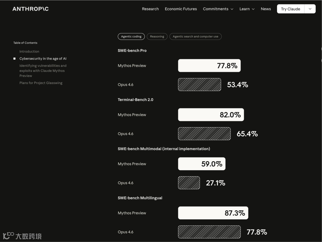 Mythos 是一个全新的模型层级。对比之前的顶级模型 Claude Opus 4.6,它更大、更智能。