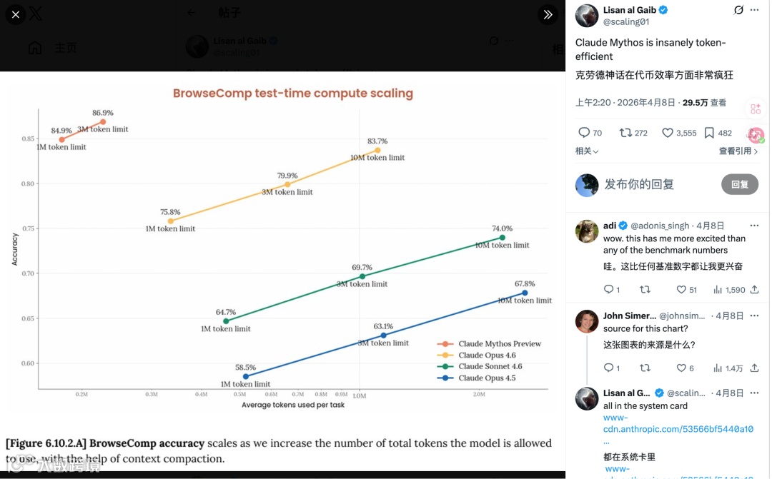 做同样的任务,达到同样的工作质量,Mythos的成本(1M)是Opus 4.6(10M)的十分之一