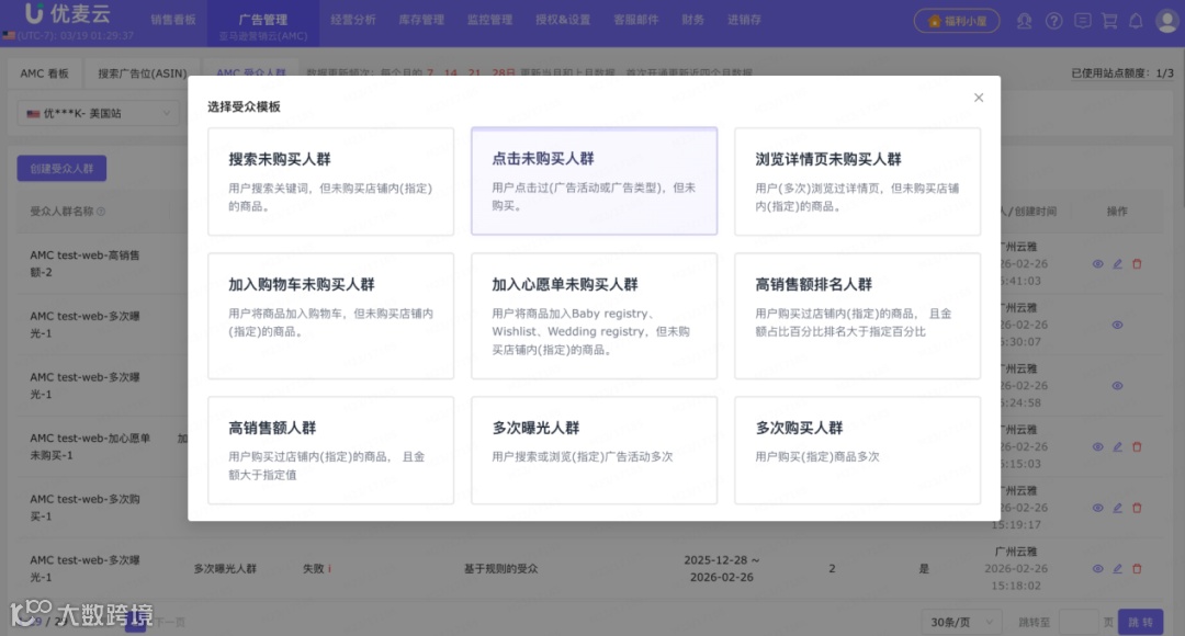 简单来说就是亚马逊AMC记录消费者在亚马逊上登录-搜索-浏览-下单的各种消费行为数据,而优麦云把这些数据打包成各种受众包,然后你直接通过优麦云把广告精准投放到这些打包的受众面前让他们挑选。