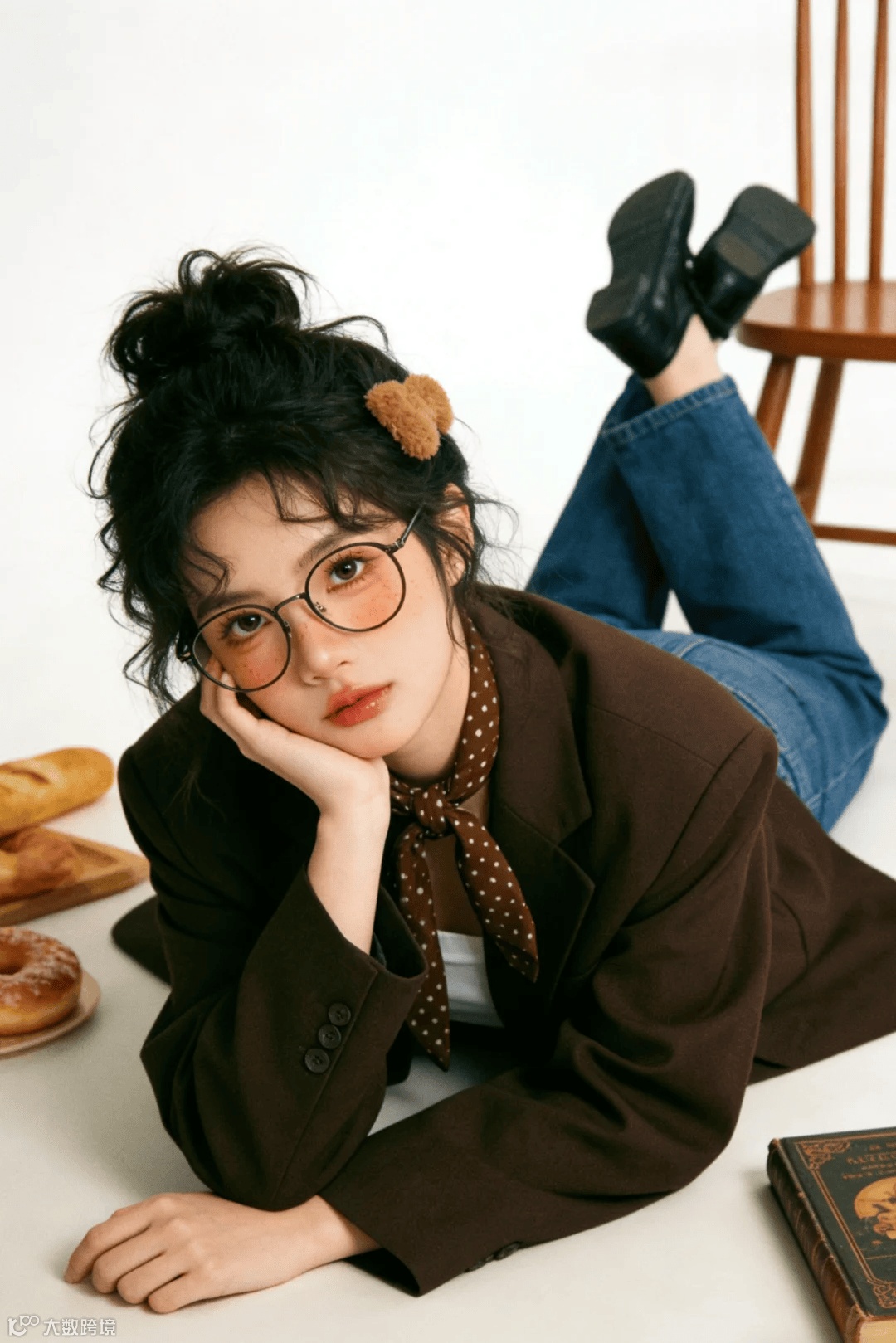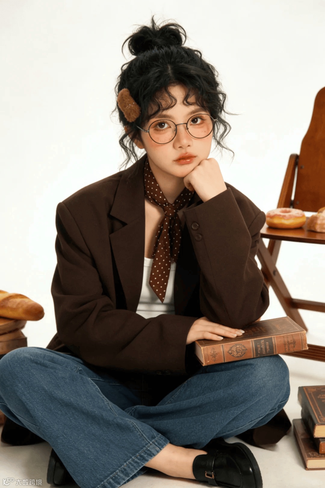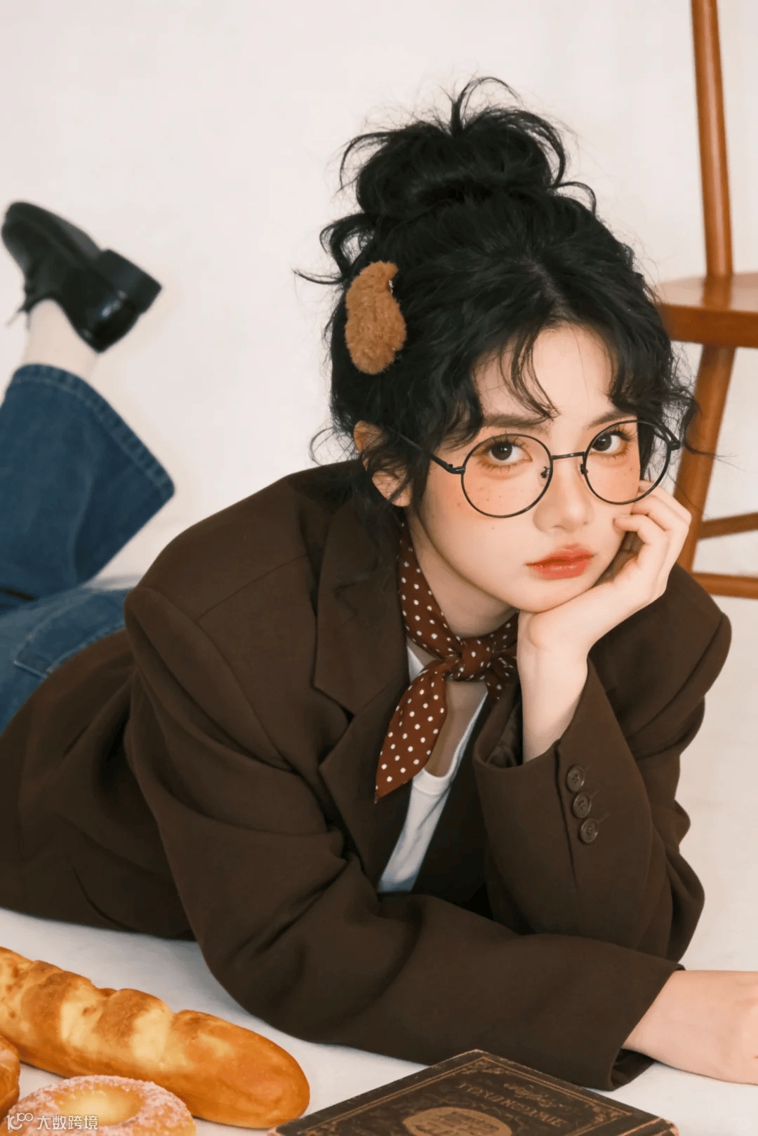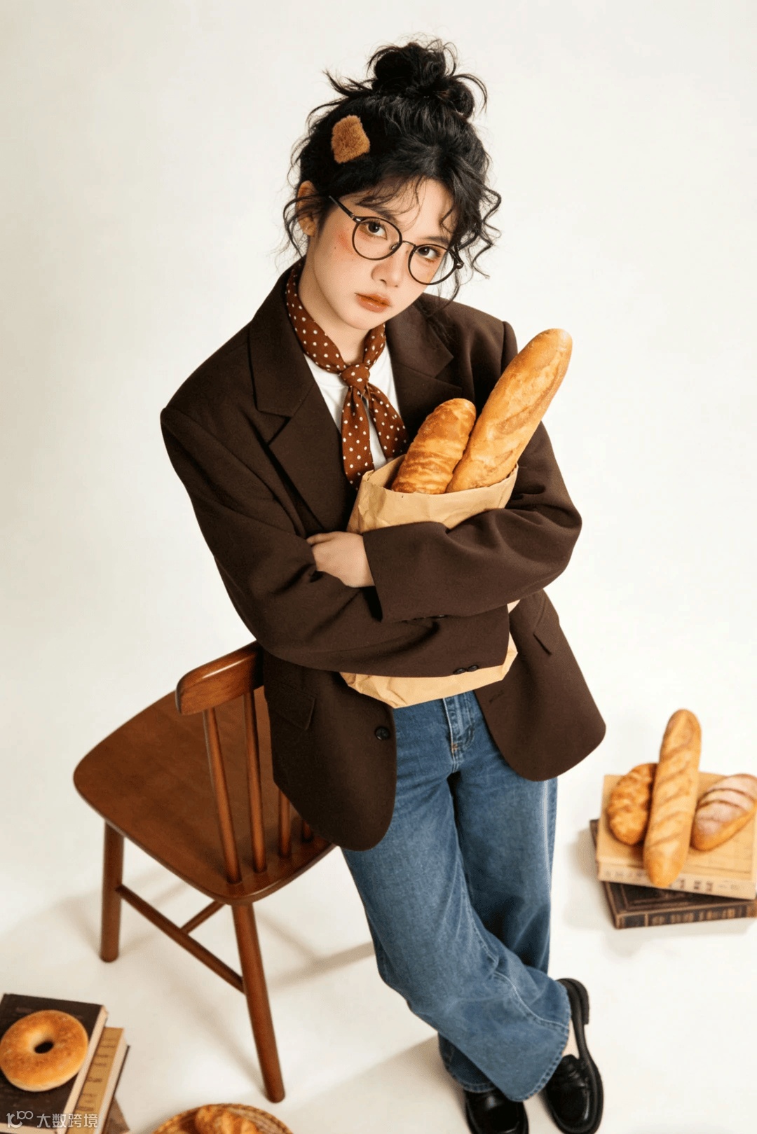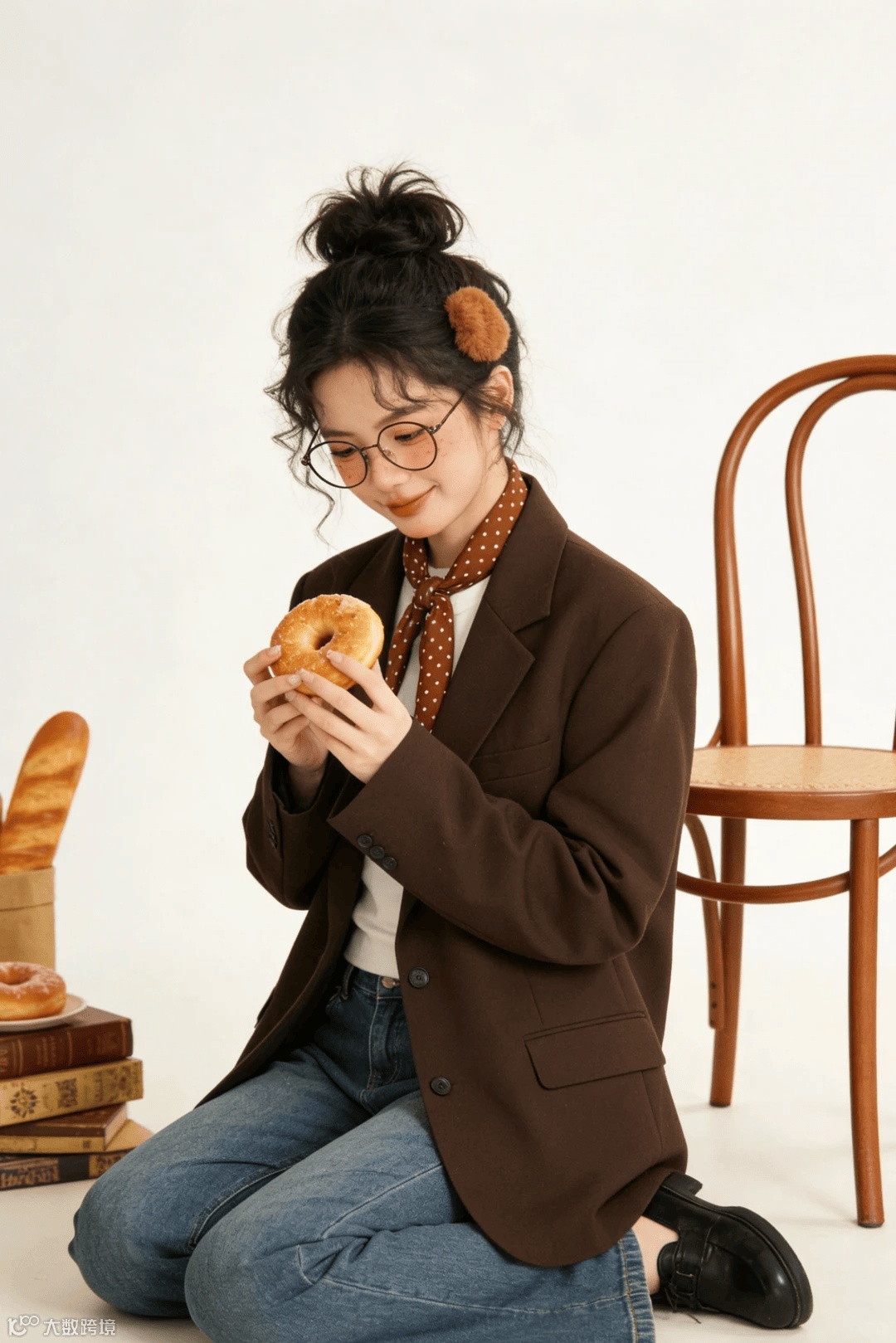 复古港风杂志写真,韩系复古面包店少女风格,保持本人五官脸型不变。造型包含慵懒羊毛卷丸子头(碎发修饰脸颊,头顶蓬松),韩系复古妆容(橘调腮红+圆框眼镜+温柔唇色+雀斑点缀)。配饰:棕色波点丝巾、圆框眼镜、棕色毛绒发饰。服装:深棕色宽松西装外套+白色内搭+蓝色直筒牛仔裤+黑色小皮鞋。背景:干净米白色背景+面包道具(法棍、甜甜圈)+复古书籍+木质椅子,采用暖调柔和自然光搭配胶片颗粒质感,营造高清细腻的复古杂志氛围。