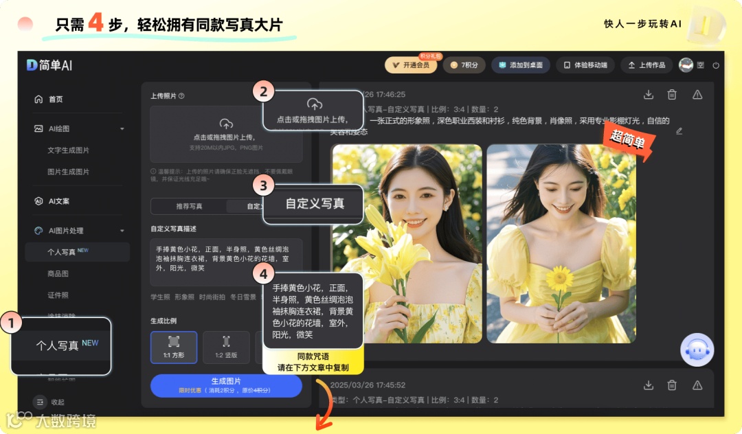 - 工具操作:网页端登录搜狐简单AI,进入【个人写真】板块,可选择预设模板或“自定义写真”;