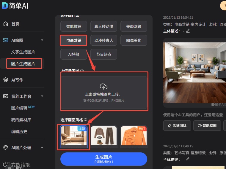 1. 选择【图片生成图片】中的电商营销模式;