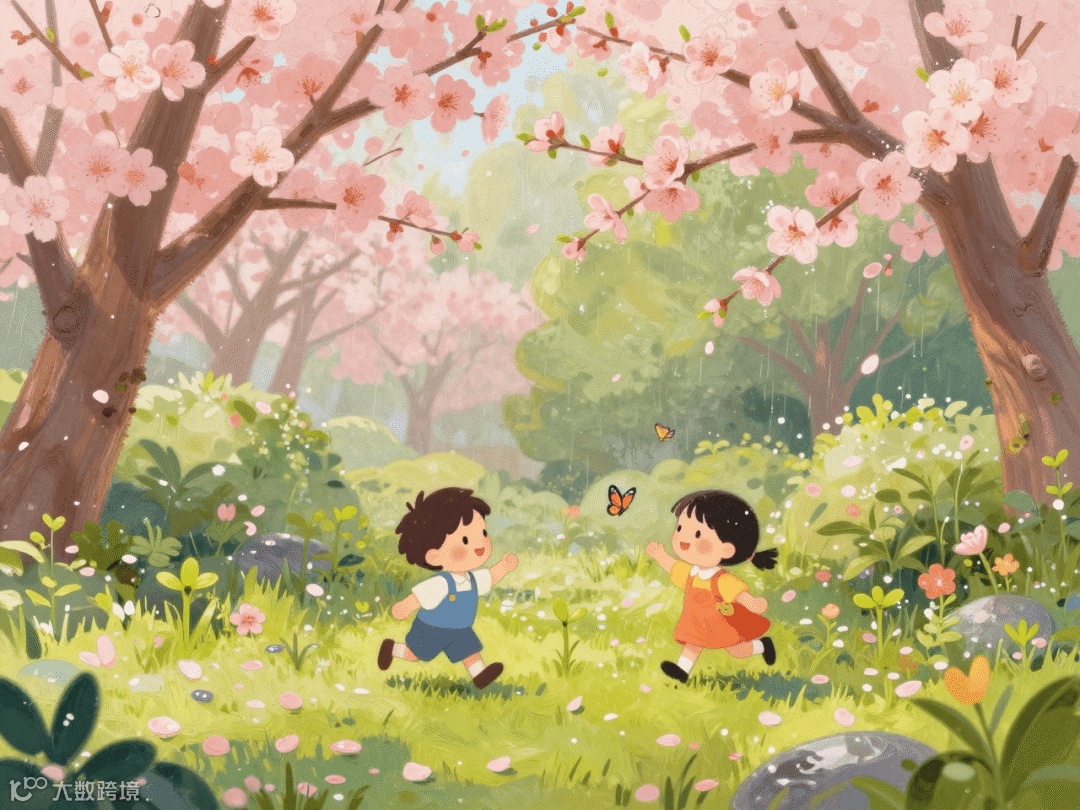 古诗教学插画:卡通风格春日花园,桃花飘落伴儿童追蝶;