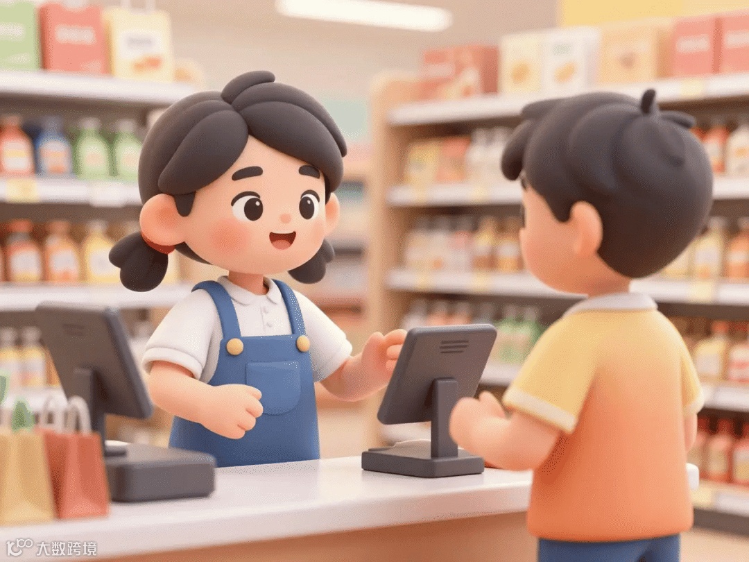 英语情景插画:超市购物对话场景,人物清晰适配课堂互动。