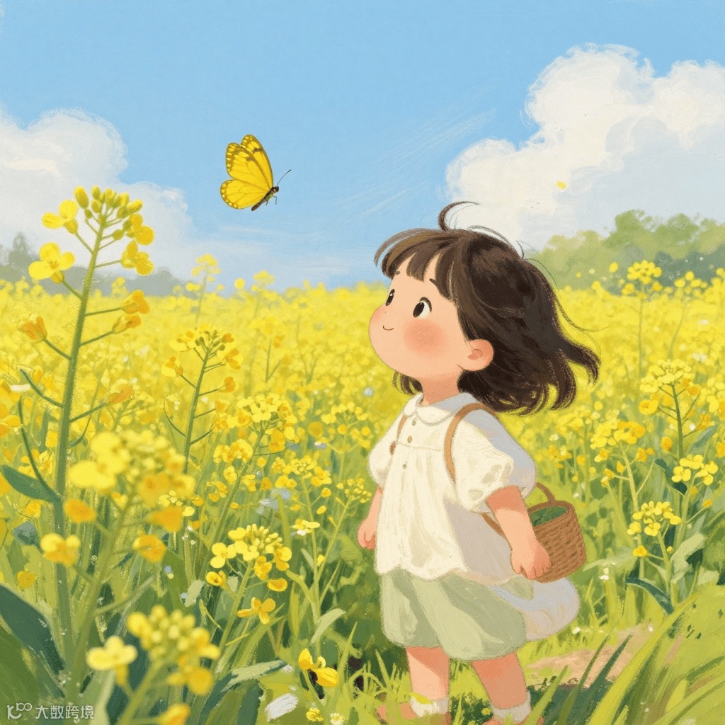 儿童追黄蝶飞入菜花,春日田园,蜡笔质感
