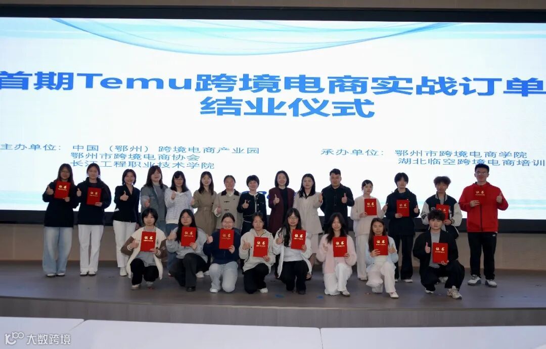 2026年4月16日,中国(鄂州)跨境电商产业园联合鄂州市跨境电商协会、长江工程职业技术学院主办的首期Temu跨境电商实战订单班在鄂州实训基地结业。14名数字商贸学院学生完成4周强化培训并通过考核,标志着政校企协同培养跨境电商应用型人才取得新突破。