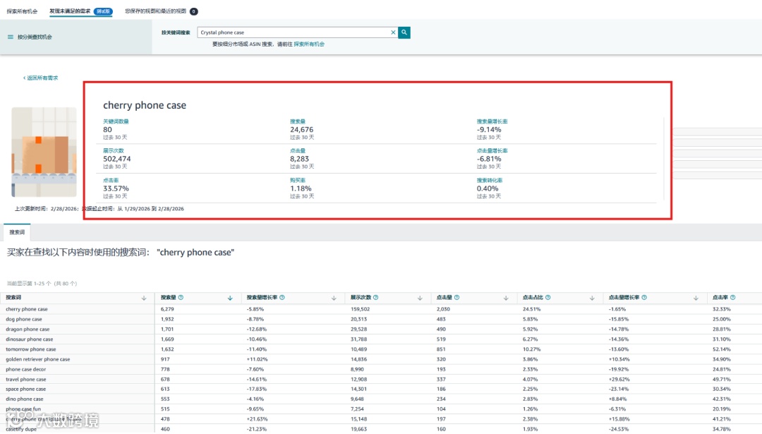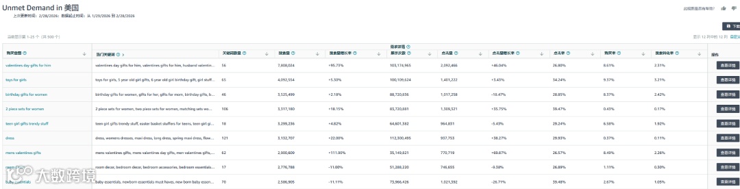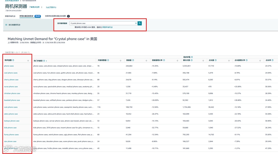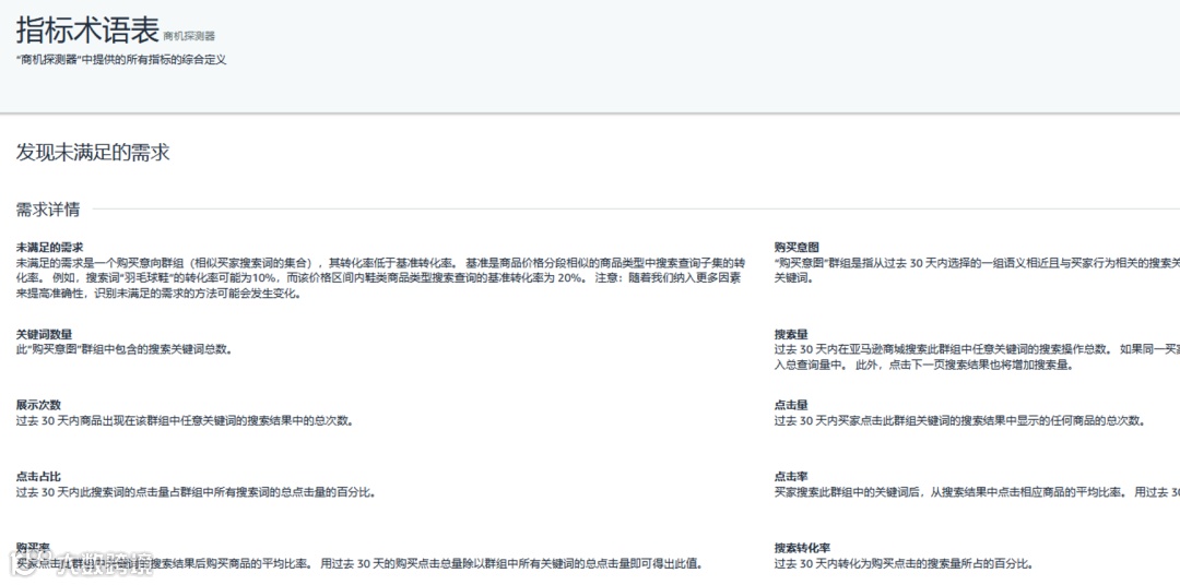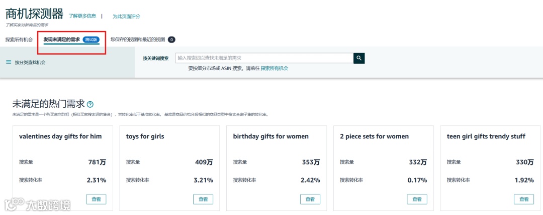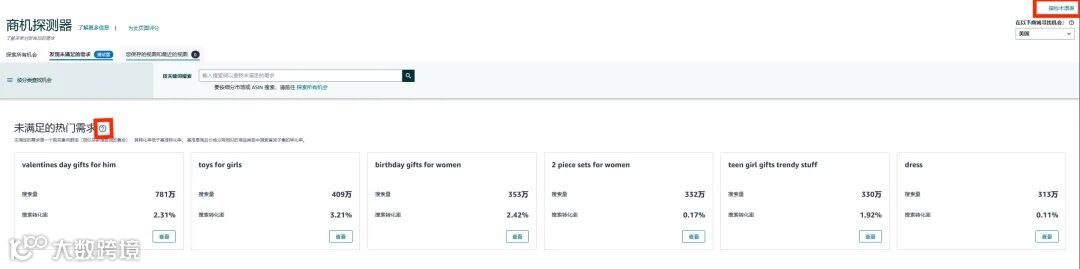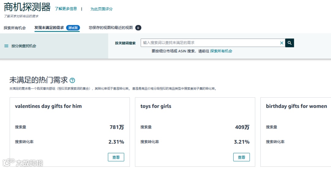 通过商机探测器「发现未被满足的需求」标签页,卖家可按类目、子类目或浏览节点筛选,高效锁定目标市场。系统自动展示: