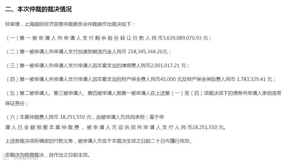 御锦的仲裁结果已生效:后者需支付股权转让款36.39亿元及违约金2.18亿元,合计38.6亿元。王健林、孙喜双及一方集团承担连带责任。
