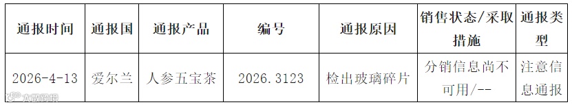 欧盟RASFF系统4月13日通报,我国出口人参五宝茶检出玻璃碎片。出口企业需严格把控产品质量,确保符合进口国安全标准。