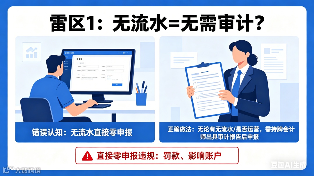 无论公司是否有流水或实际运营,均需经持牌会计师出具审计报告后申报。直接零申报属违规行为,将面临罚款及账户异常风险。