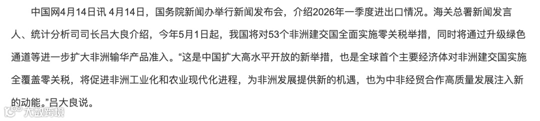 自2026年5月1日起,中国对53个非洲建交国100%税目产品实施零关税,系全球主要经济体首个全覆盖举措: