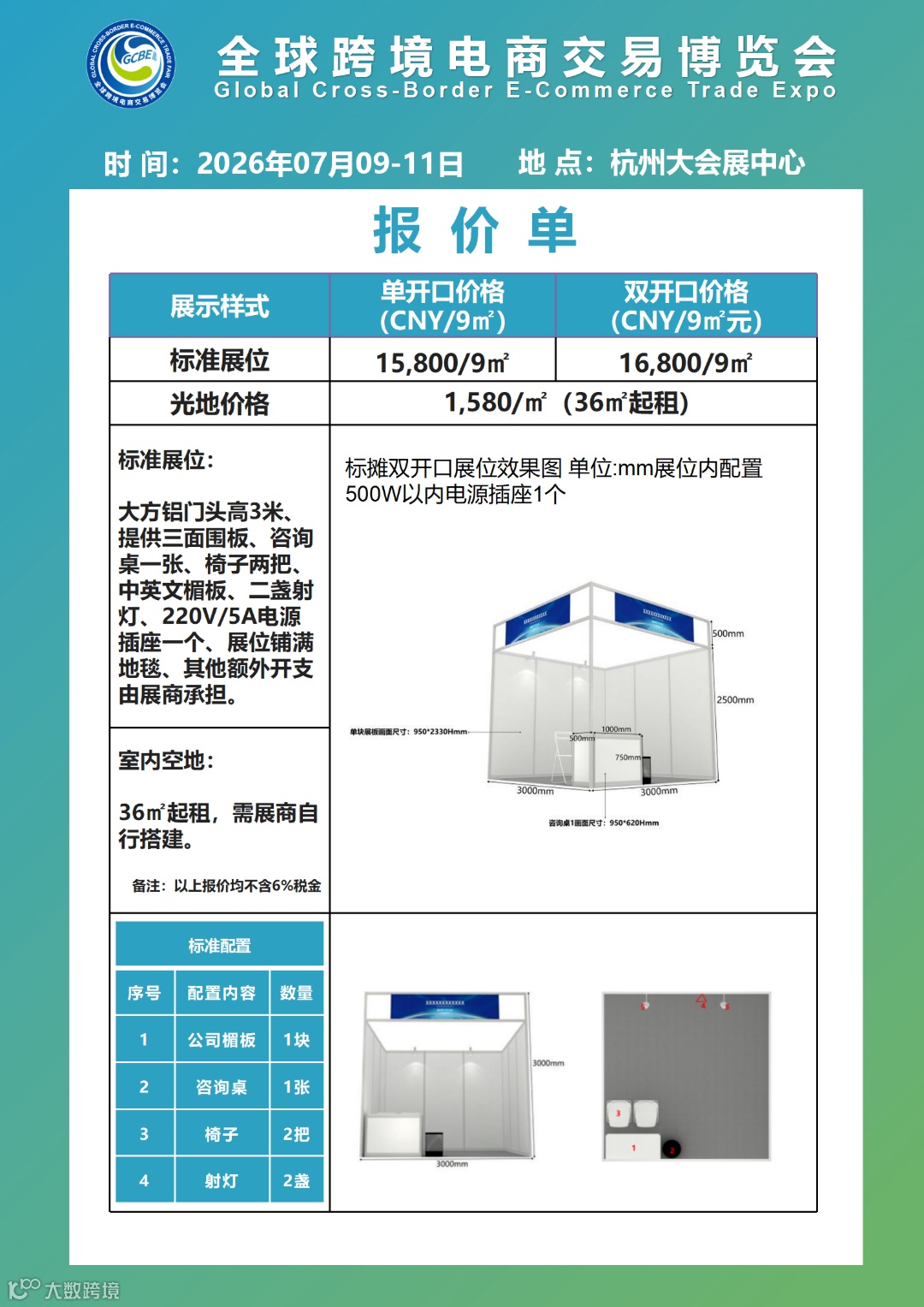 2026年7月9日-11日,以“在杭州·看见跨境未来”为主题的2026全球跨境电商交易博览会将在杭州大会展中心举办。展会规模达10万㎡,集结3500+全产业链优质展商,预计吸引10万+专业观众到场采购。
