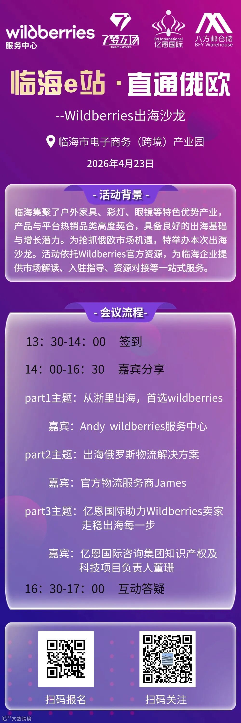 临海户外家具、彩灯、眼镜等产业与Wildberries热销品类高度契合,出海基础扎实。本次活动特邀Wildberries官方,提供市场分析、入驻指引及资源对接,助力本地企业拓展俄欧市场,培育外贸新动能。