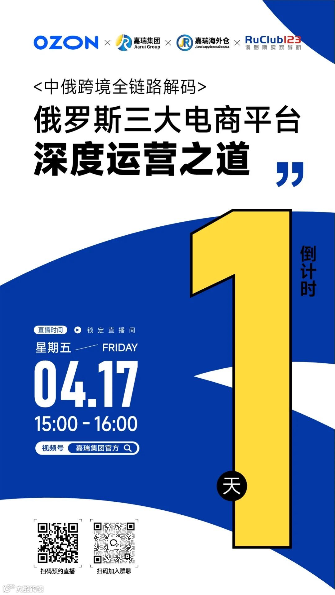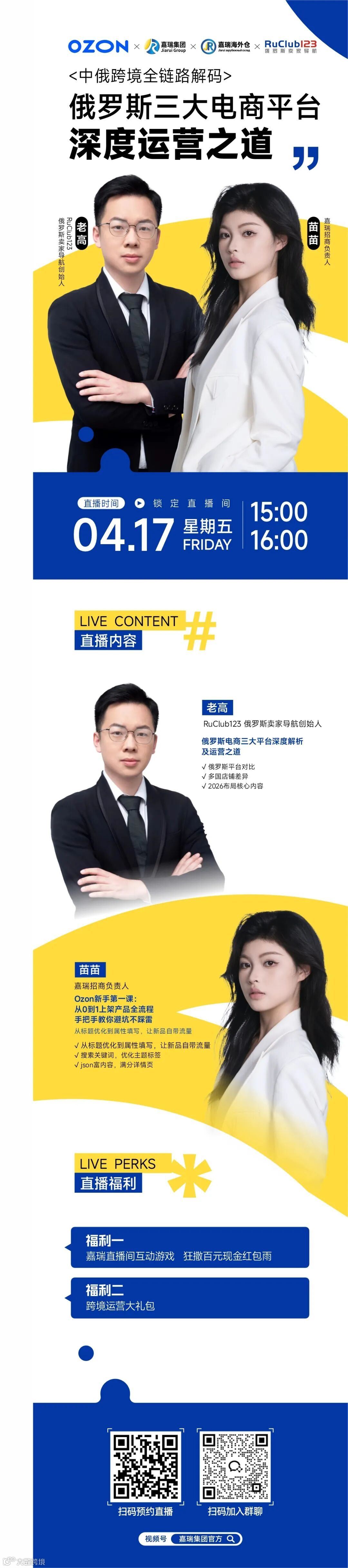 4月17日,嘉瑞集团招商负责人余苗与RuClub123创始人老高将基于26年实战经验,深度解析平台运营关键策略: