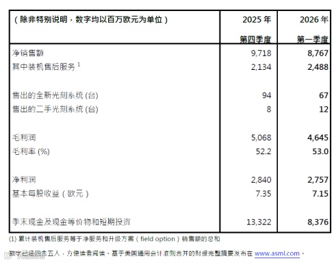 当季实现净销售额88亿欧元,毛利率53.0%,净利润28亿欧元。其中装机售后服务收入24.88亿欧元,售出全新光刻系统67台、二手系统12台。季末现金及短期投资达83.76亿欧元,毛利率环比微增0.8个百分点。
