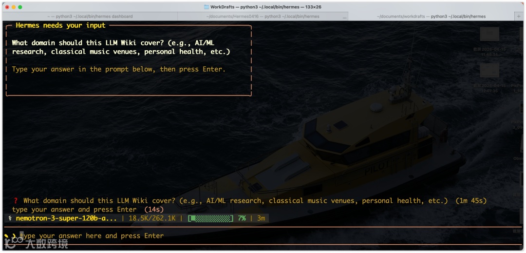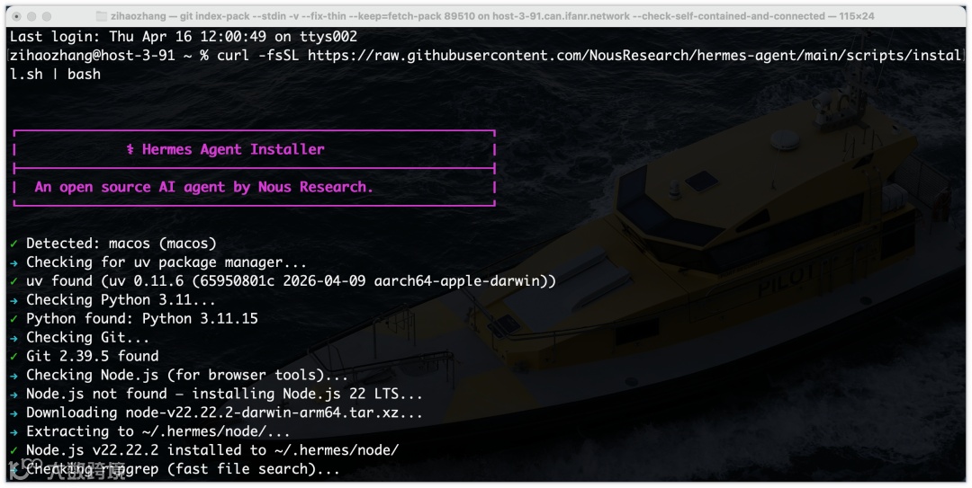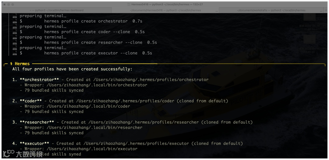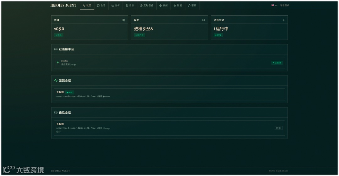 hermes 启动服务。最新版本提供 WebUI 控制台(执行 hermes dashboard 打开本地页面),支持模型切换与平台管理,操作更直观。