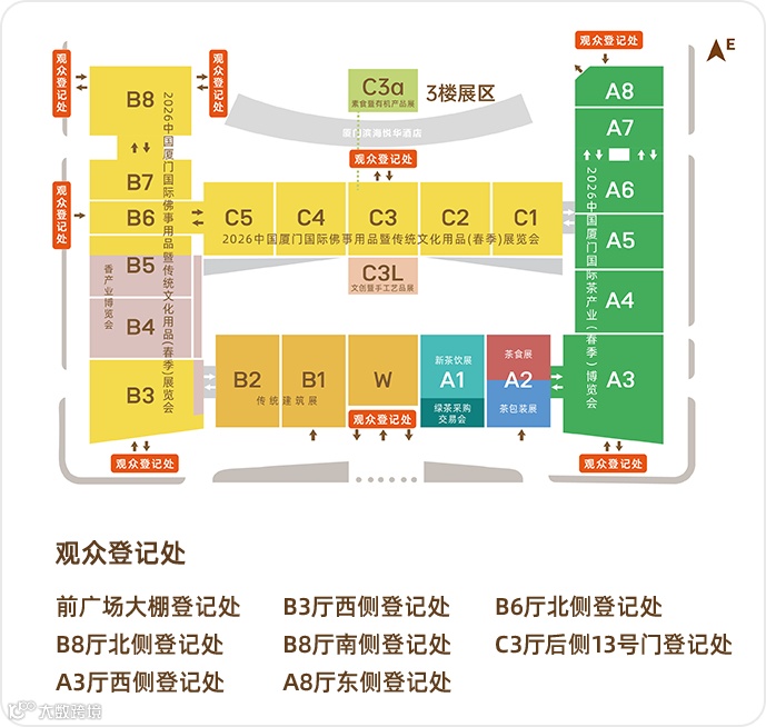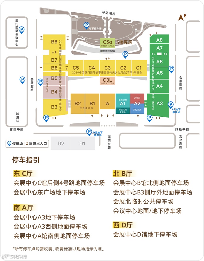 展馆设置8个观众登记处,周边提供10个收费停车场。