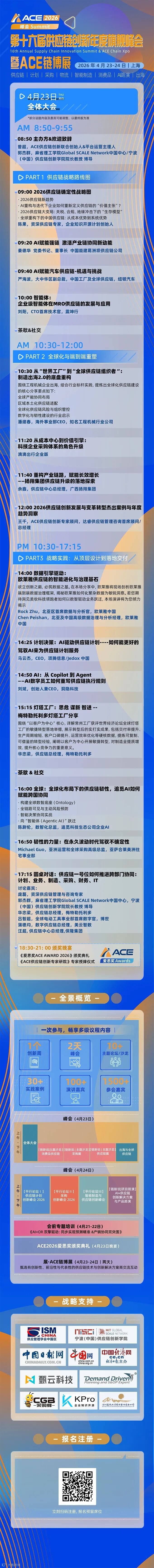 ACE2026供应链创新大会全体会议(4月23日全天)将汇聚20位行业领袖,深度剖析供应链重构核心议题:全球化布局、AI智能体应用及数据韧性体系建设。重磅嘉宾包括: