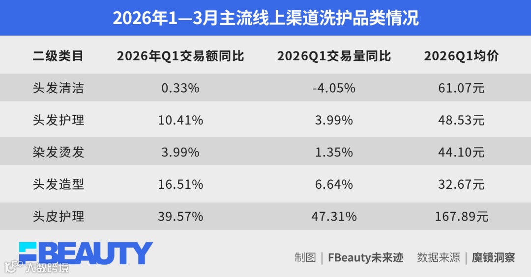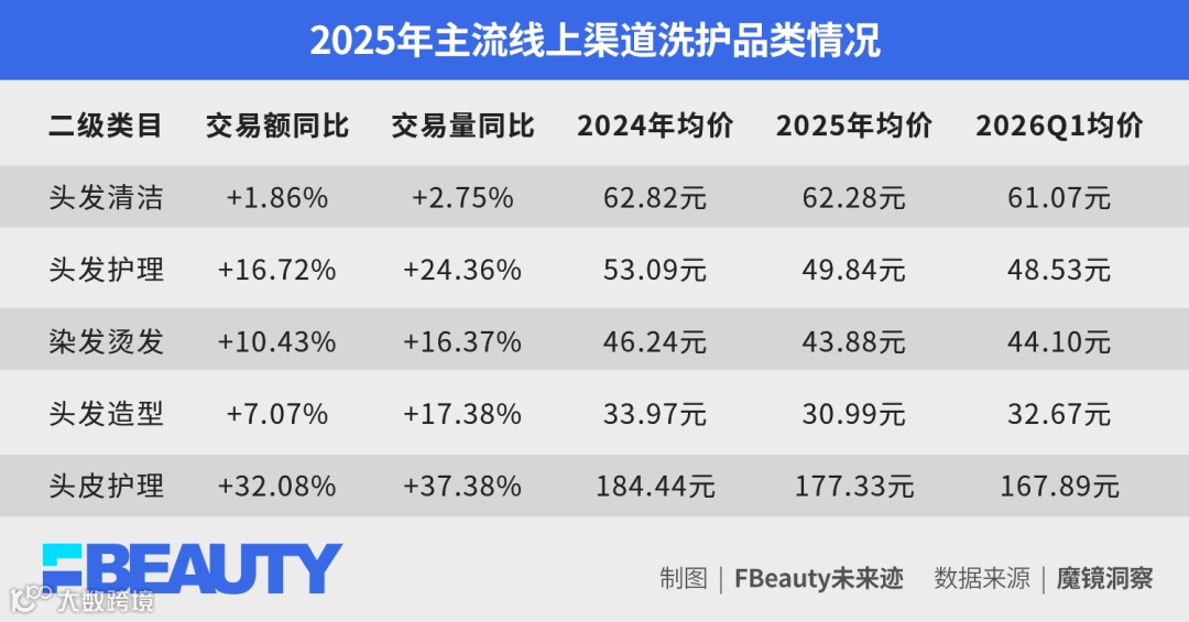 洗发水类目(占大盘超50%)增长几近停滞,护发素、发膜等护理类目及染烫品类虽保持双位数增长,均价却持续下滑。2026年Q1数据显示,除基础清洁类目交易量微降外,其余品类交易额增长伴随均价进一步下探,证实行业已进入高频次、高性价比消费阶段。