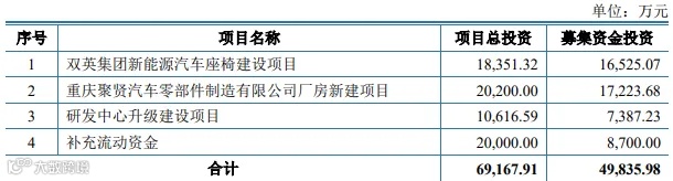 拟募资4.98亿元,投向双英集团新能源汽车座椅建设项目、重庆聚贤汽车零部件厂房新建项目、研发中心升级及补充流动资金四大领域。