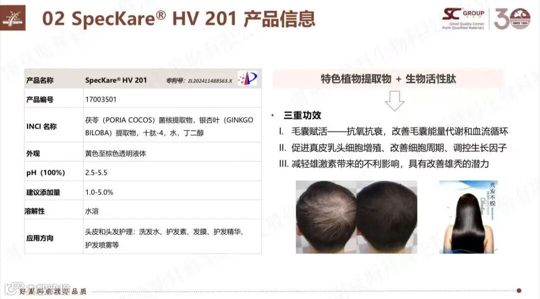 SpecKare® HV 201:由十肽-4与茯苓菌核提取物复配,多通路协同改善头皮健康,有效预防脱发。