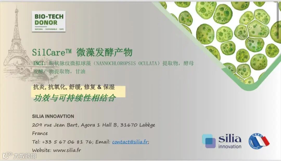 SilCare™微藻发酵产物:萃取自法国地中海微藻,含0.3毫克/毫升多聚脱氧核糖核苷酸,提供抗炎修复及紧致提亮功效。