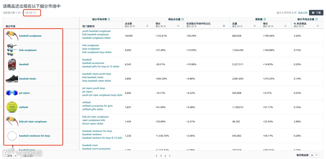 亚马逊卖家可利用商机探测器模块查询ASIN的流量类型归类。以ASIN:B0CLDB4NND为例,该棒球太阳镜被亚马逊官方归类为30余种流量类型,包括:精准流量(baseball sunglasses/kids sunglasses)、关联场景流量(boys baseball shirt/baseball cleats)及礼物粉丝场景流量(sports toys for boys 8-12/cincinnati reds)。