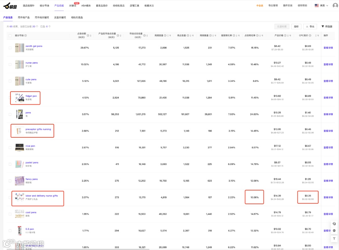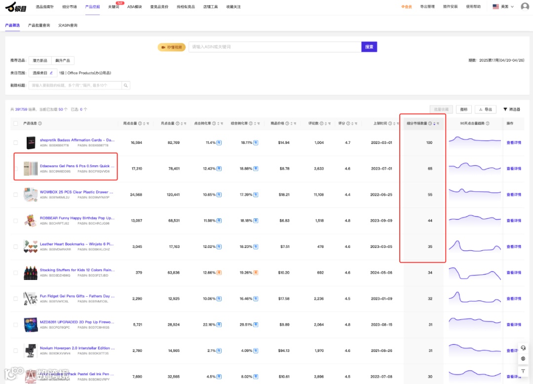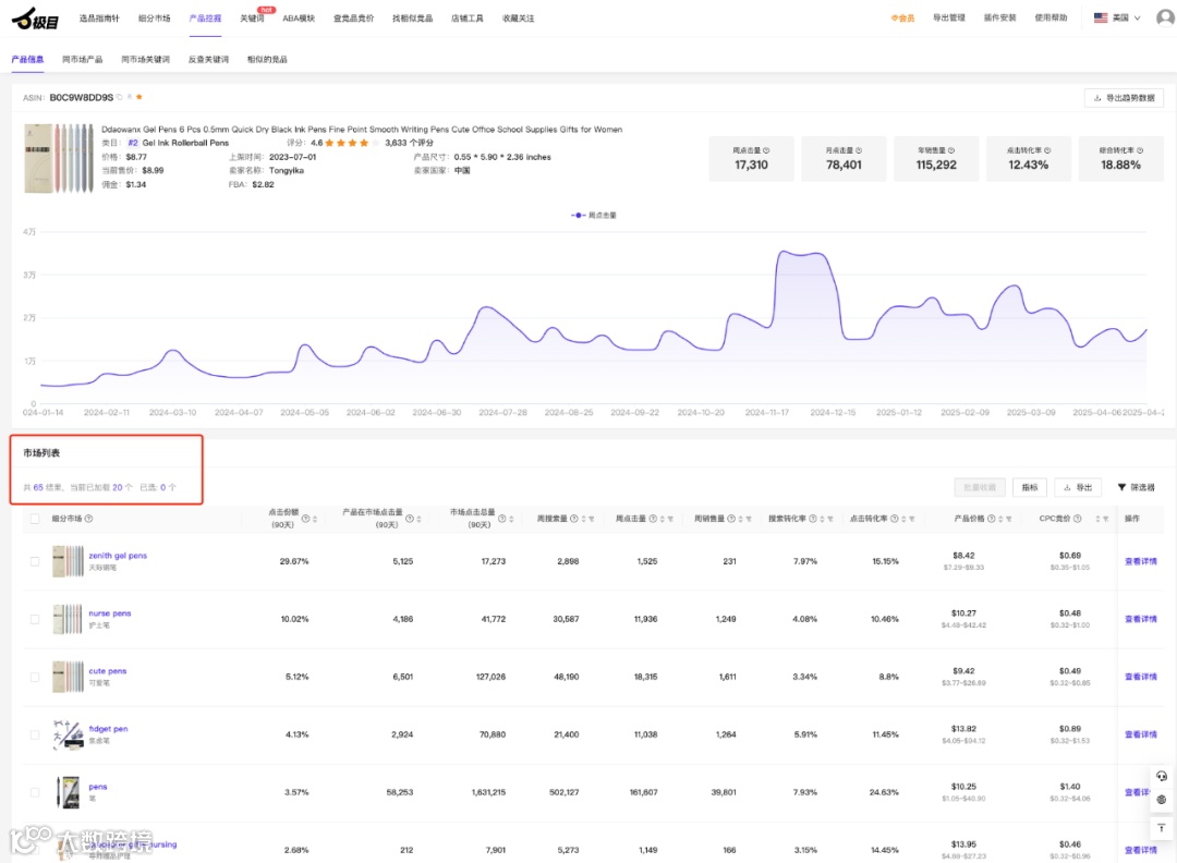 按"细分市场数量"(即流量类型数量)降序排列,筛选结果中凝胶笔产品达65种流量类型。