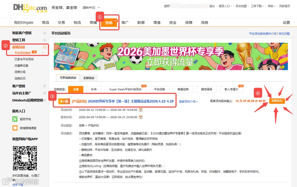 世界杯活动报名:https://seller.dhgate.com/promoweb/platformacty/getPromoDescView.do?promid=18412503&viewpagetype=#/