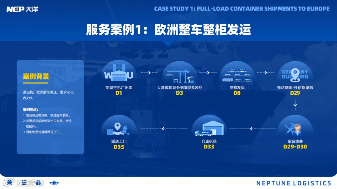 深圳市大洋物流股份有限公司(简称"大洋物流集团")专注提供安全高效、具有竞争力的"端到端"综合物流解决方案。作为国际多式联运专家及"一带一路"践行者,深耕欧亚市场二十余年,以中欧班列为核心,服务网络覆盖深圳、莫斯科、杜伊斯堡等400余个城市。