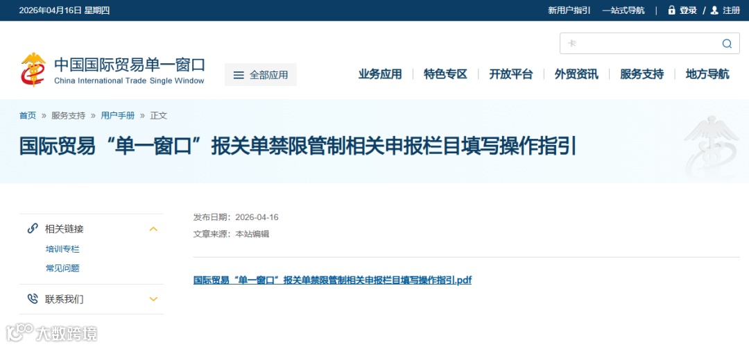 为进一步规范出口货物申报管理,海关总署对报关单新增“禁限管制识别码”和“禁限管制申报要素”项目,属有条件必填项。具体填制要求可通过“中国国际贸易单一窗口”(https://www.singlewindow.cn)查询。