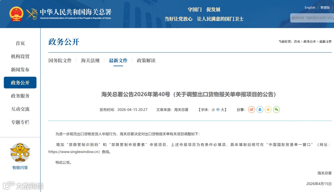 海关总署公告2026年第40号(关于调整出口货物报关单申报项目的公告)