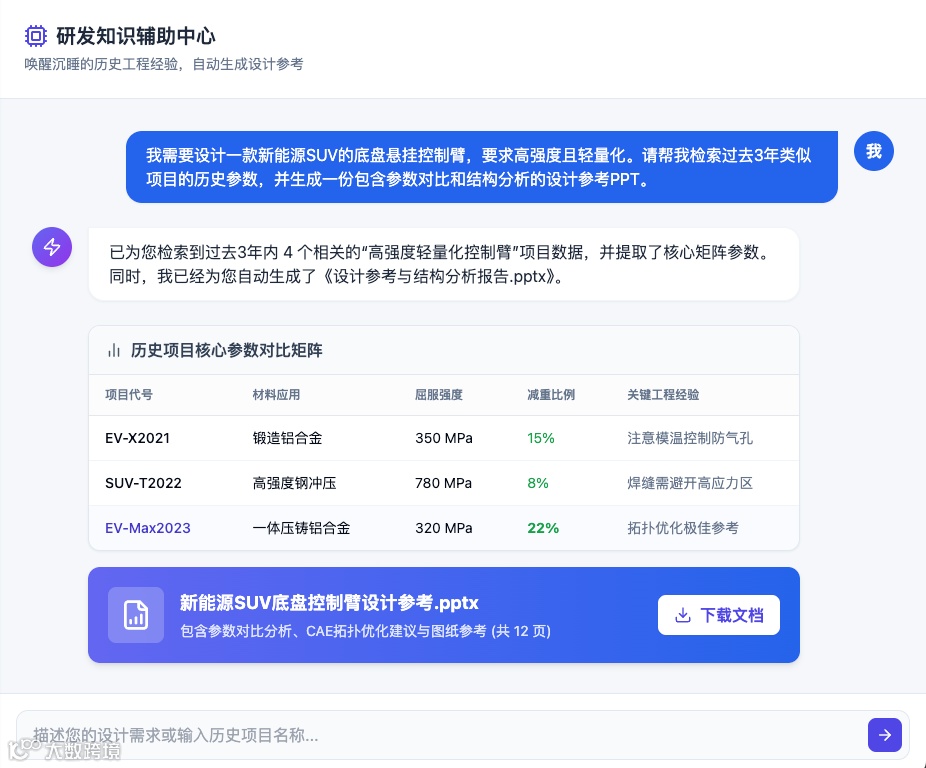 系统不仅能定位历史项目参数,还可自动生成含参数对比、结构分析的设计参考PPT,将资深工程师数天工作量缩减至分钟级。