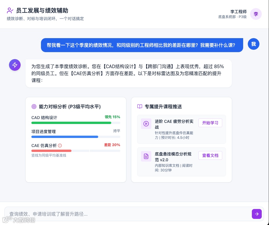 新员工可一键获取能力差距分析及定制化培训课程,实现查绩效、做对标、找课程全流程自动化,同步推动人才能力升级。