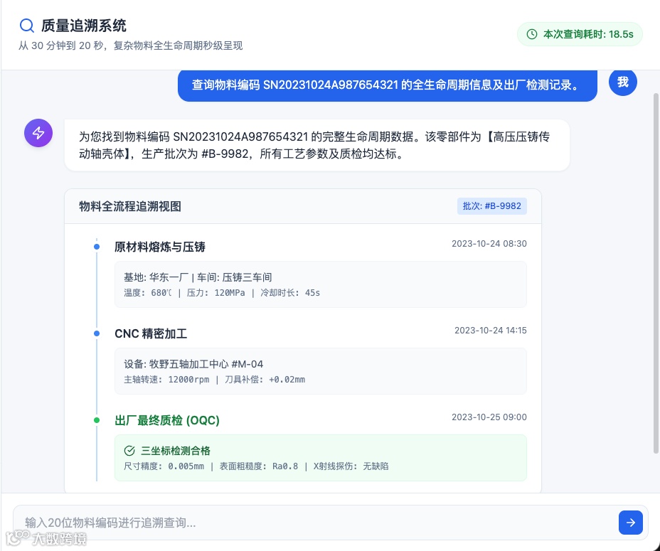 工程师输入复杂物料编码后,系统秒级返回零部件全生命周期信息(生产批次、工艺参数、检测记录),大幅缩短历史数据查询时间。