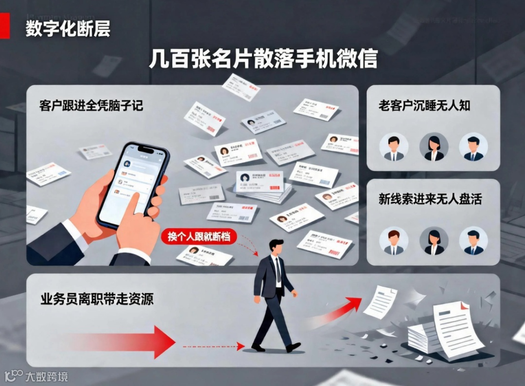 展会后,企业常面临客情管理难题:数百张名片散落于业务员手机与微信,客户跟进依赖人工记忆,导致线索流失与客户沉睡。这反映出外贸行业普遍存在的数字化断层。展会流量能否转化为持续订单,取决于后续跟进体系——是否实现线索集中管理、建立防流失机制、以数据支撑市场决策。