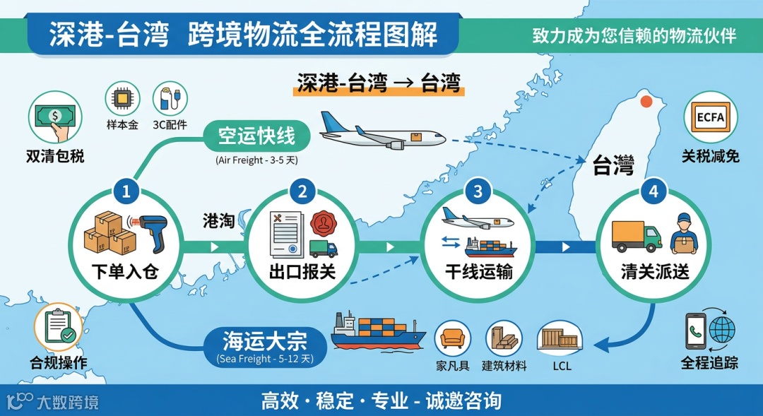 3. 干线运输: 通过空运/海运直达台湾。
