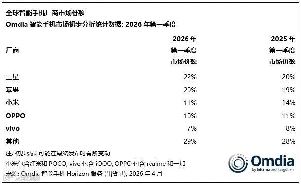 Omdia最新数据显示,2026年第一季度中国大陆智能手机出货量为6980万台,同比微降1%。核心原因在于存储芯片等关键零部件价格上涨,倒逼厂商提价压缩消费者需求。该机构预计,2026年全年市场将延续下行趋势,出货量下滑约10%。