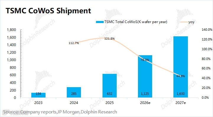 季度资本开支111亿美元,全年计划上调至520-560亿美元,下半年将集中投入440亿美元。CoWoS封装产能达月产8万片,预计2026年底扩至12万片,AI芯片出货量预计同比增77%。