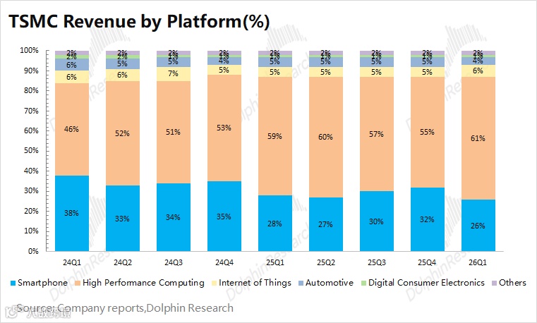 高性能计算(HPC)贡献61%营收,达219亿美元,主要由英伟达Blackwell、博通TPU等AI芯片带动,环比增18%。手机业务季节性回调13%至93.3亿美元,HPC与手机业务合计占比87%。