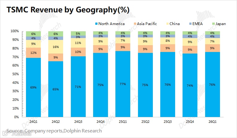 7nm以下先进制程占比维持74%高位,其中3nm收入占比25%,5nm占比36%。随着2nm量产,AI芯片将全面转向3nm平台,产品结构持续向高附加值制程倾斜。