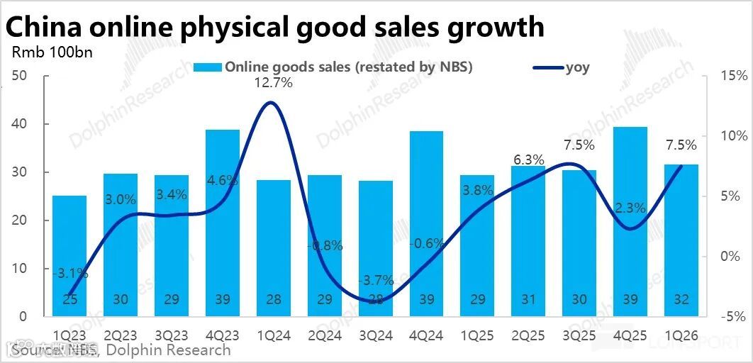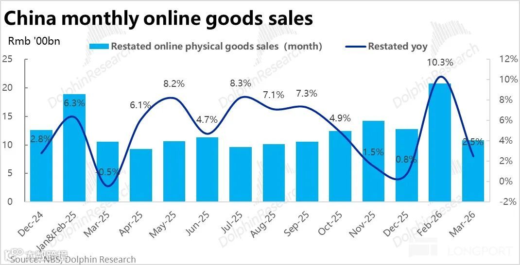 3月线上实物零售额同比仅增2.5%,较1~2月10.3%大幅回落。一季度虽录得7.5%增长,但二季度起受高基数影响,电商增速压力加剧。