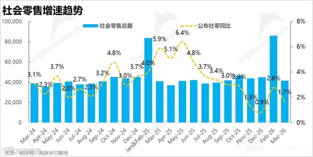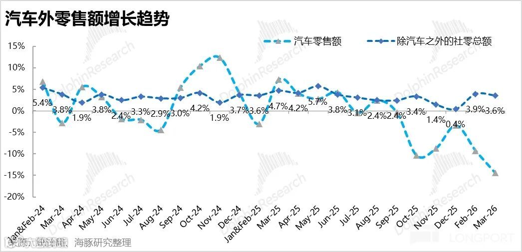 汽车销售3月同比跌幅超10%,剔除汽车后社零增速达3.2%,显示其他商品消费基础仍存。家电与家具受国补退坡冲击显著,销售额分别下滑5%和9%。