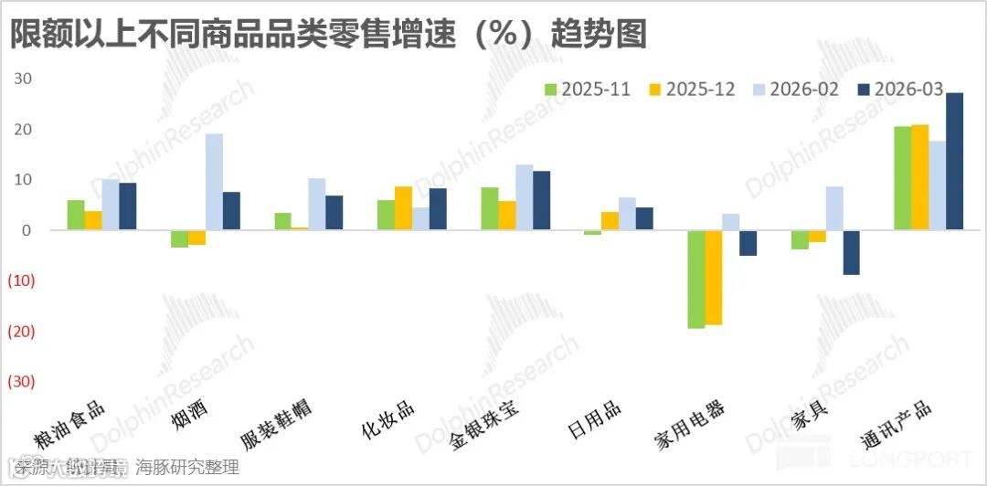 通讯产品(以手机为主)保持强劲增长。化妆品、金银首饰等可选消费表现平稳,未现系统性回落。