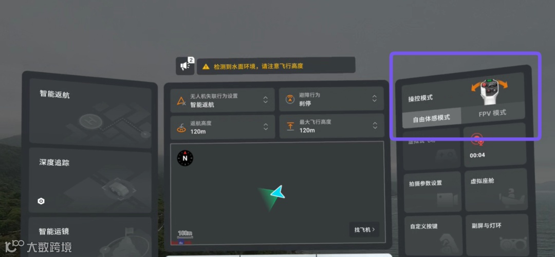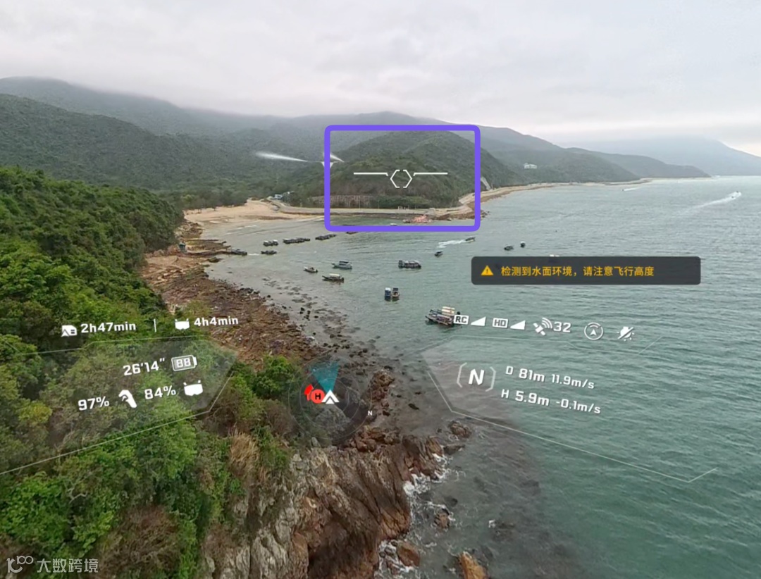 我们以实际的一次飞行画面为例,上图中紫色方框中的指示标识就是无人机的飞行方向,也是 Grip 体感遥控器目前正对着的方向。上下左右移动 Grip 体感遥控器就可以改变指示标识的方向,从而改变无人机的飞行方向,类似于「指哪飞哪」的体感操控模式,非常符合直觉。你只需要关注「要往哪边飞」和「这个方向有没有障碍」,而不用在大脑里不断翻译摇杆的操作逻辑。