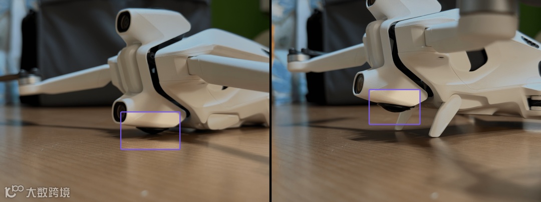 为此影翎 A1 配备了一对可以机械升降的脚撑,这就有点像民航客机上的起落架,在开机和无人机降落前会自动展开,又会在无人机起飞后自动收起(如上图),避免了磕碰。