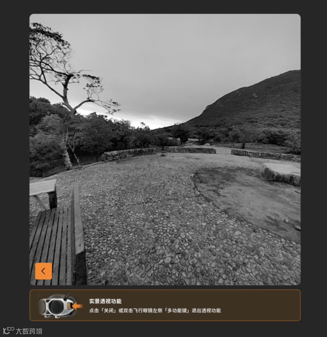 这副飞行眼镜还支持实景透视,在这个模式下用户可以在不摘下眼镜的情况下看到周围环境,减少完全沉浸时的不安全感。稍微有些遗憾的是,这是一颗黑白摄像头,没有彩色画面。