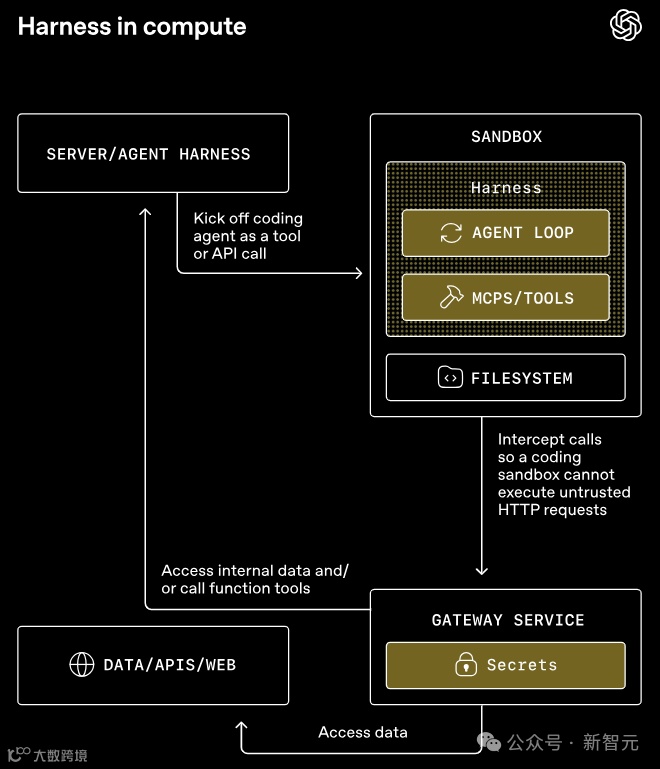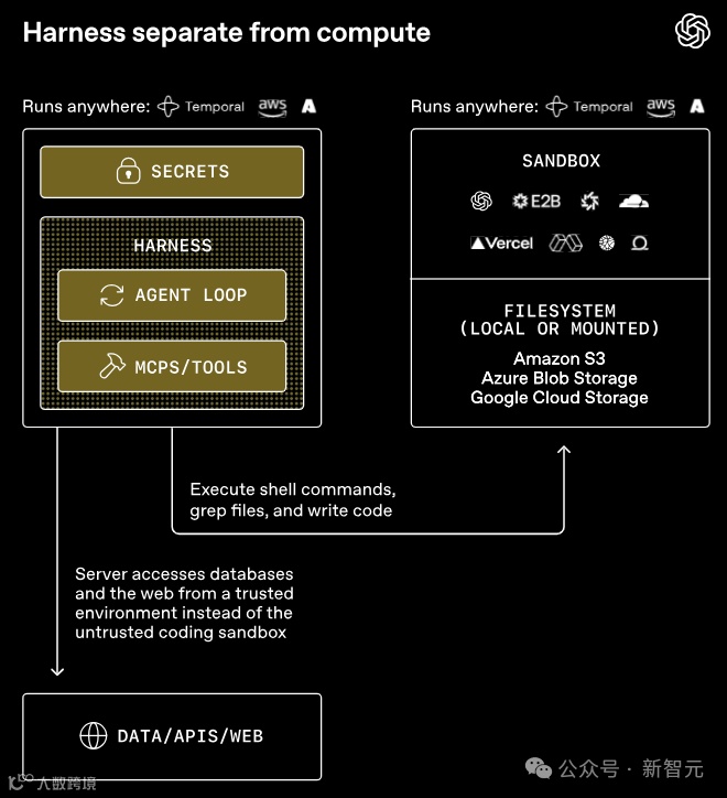 harness跑在你的可信基建里,管模型调用、审批、追踪、运行状态。compute是一个独立的沙盒,专门负责读写文件、跑命令、装包、吐产物。