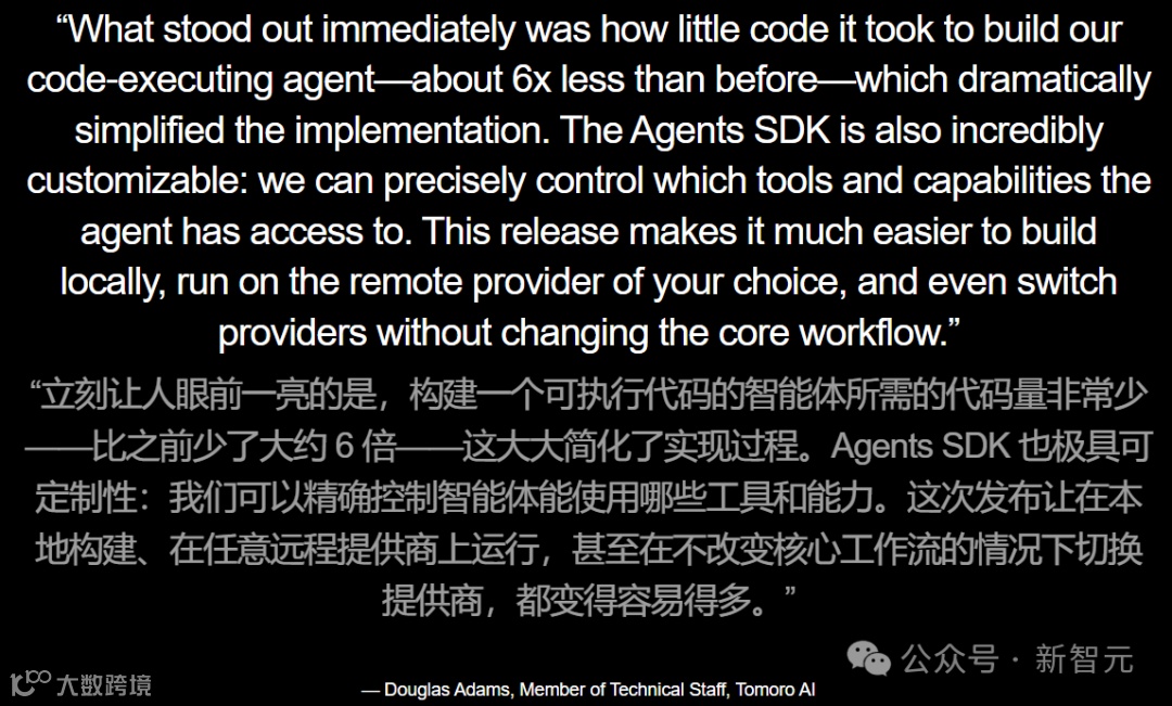 Tomoro AI研发工程师Douglas Adams给出了另一组硬数字,相同能力的Agent,这次需要的代码量比以前少了6倍。